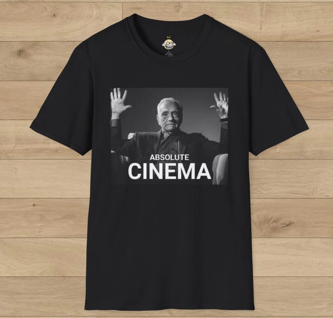 This T-shirt features the now-iconic black-and-white image of legendary filmmaker Martin Scorsese with his hands raised, overlaid with the viral phrase “ABSOLUTE CINEMA”. It’s the perfect piece for expressing your approval of high-quality media, film analysis, or simply good internet humor.