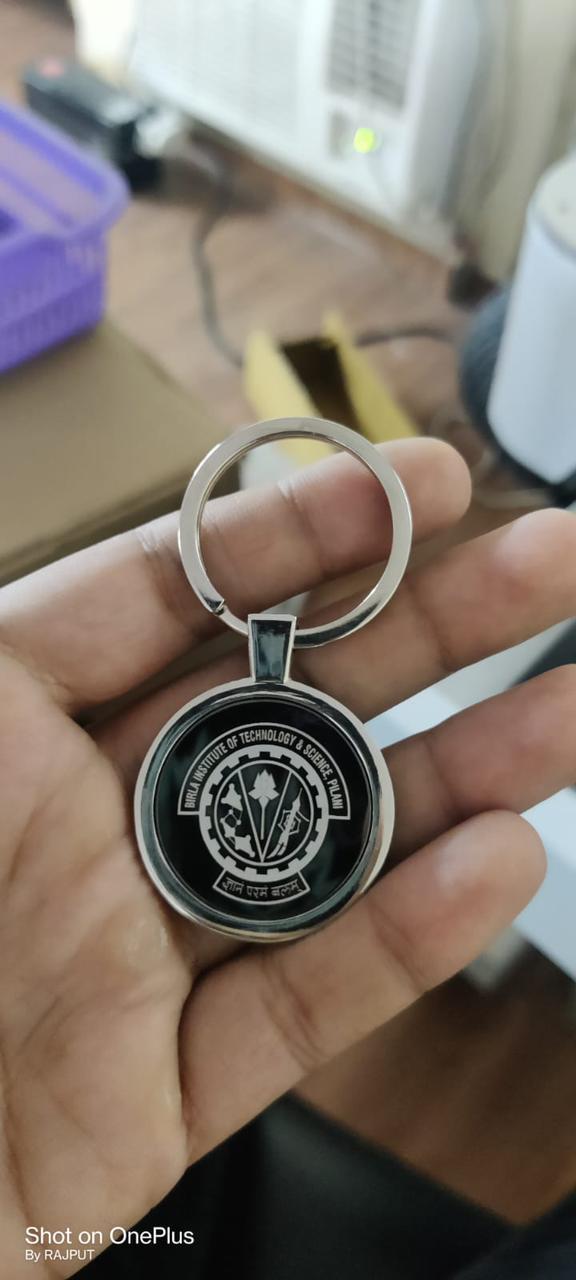 Crafted from high-quality polished metal, this keychain features a circular face perfect for showcasing intricate logos, university crests, or custom text (as demonstrated with the BITS Pilani emblem). The surface can be finished with durable enamel or domed resin for a long-lasting, glossy look that truly makes your design pop.