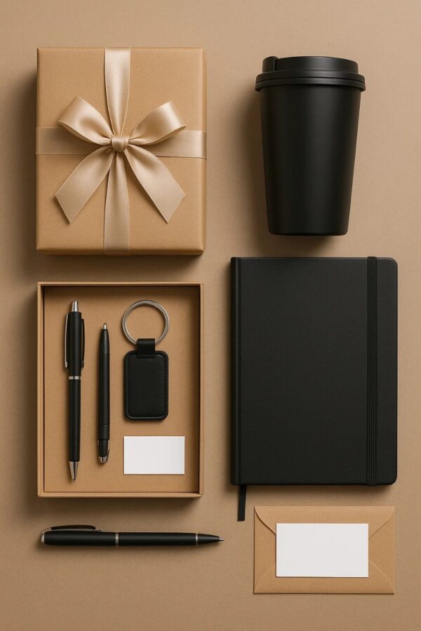 Ready for Branding: All flat items (Notebook, Tumbler, Keychain) are perfect for showcasing a company logo or name via laser engraving.